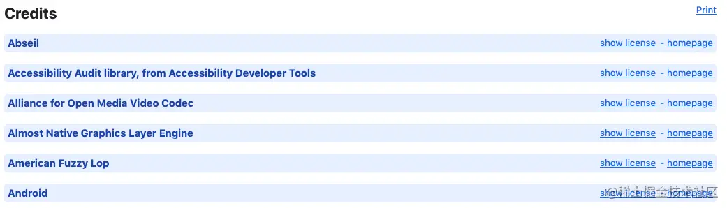 点击“开源软件”,会打开一个页面,列出了一长串的开源软件、其LICENSE和主页(或代码托管地)。