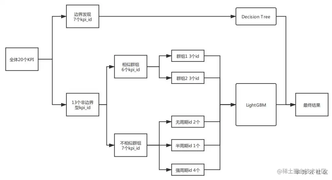 赛题**有20个不同的KPI,KPI物理意义不同且异常的种类也多种多样,若将所有KPI作为一个整体建立一个统一的二分类模型,模型效果差强人意,难以进入前排,但若对每个KPI单独建模,则需要建立并维护调优至少20个不同的模型,维护成本过高,因此我的思路是将KPI或异常进行分类建模。