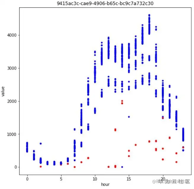 以kpi_id= 9415a… 为例,若将日期信息剥离,x轴仅为一天中的第几小时,y轴仍然为时间序列取值,则会得到如Fig5的展示。此时整个时间序列被呈现在一个二维空间中,且异常值(红点)多与正常值(蓝点)偏离较远,一个朴素的思路便是采用无监督方法识别图中的异常。事实上,在实际的生产环境中,多达5000+原始KPI,300+衍生KPI,难以获得有异常标注的时间序列,因此在生产环境中往往使用统计方法或无监督算法进行异常检测[1,2]。但在当前有标签的赛题下,经多次尝试,无监督算法如iForest,DBSCAN以及时间序列分解方法如Prophet均无法胜过有监督机器学习算法。因此,对于非边界型异常,最终决定使用有监督机器学习算法进行建模。
