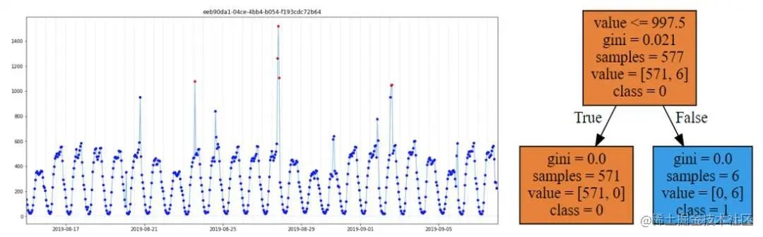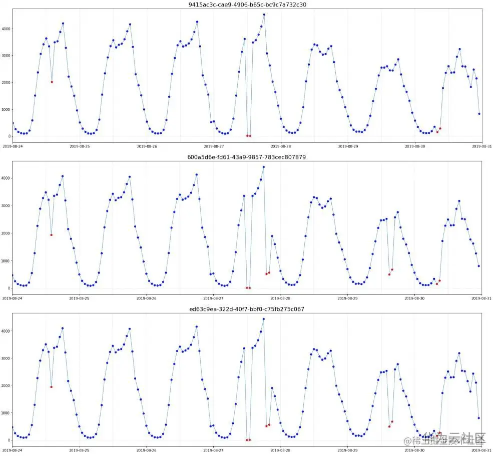 Fig3. 异常分类(时间序列中红点为异常,蓝点为正常)