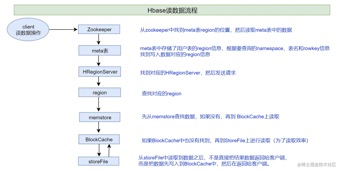 - 客户端首先从zk找到meta表的region位置,然后读取meta表中的数据,meta表中存储了用户表的region信息