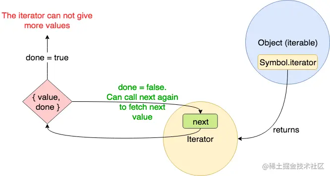 ECMA采取了类似的步骤,来标准化循环自定义对象的过程。但是,ECMA使用Symbol.iterator而不是iteratorMethod。 Symbols提供唯一且不能与其他属性名称冲突的名称。 此外,Symbol.iterator将返回一个名为iterator的对象。 这个迭代器将有一个名为next的方法,它将返回一个包含key为value 和 done对象,