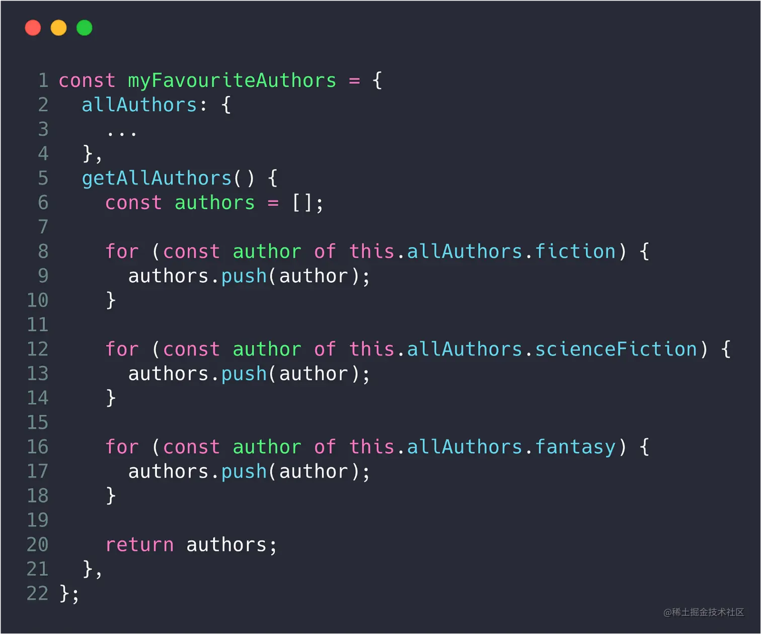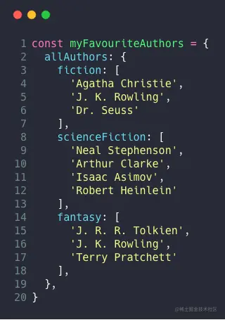 现在, myFavouriteAuthors 是一个包含了对象 allAuthors 的对象,allAuthors包含了三个数组,对应key值为fiction, scienceFiction,和 fantasy。 现在如果需要遍历myFavouriteAuthors **来获取所有的作者, 你的方法是什么?**你可以继续尝试一些循环组合来获取所有数据。