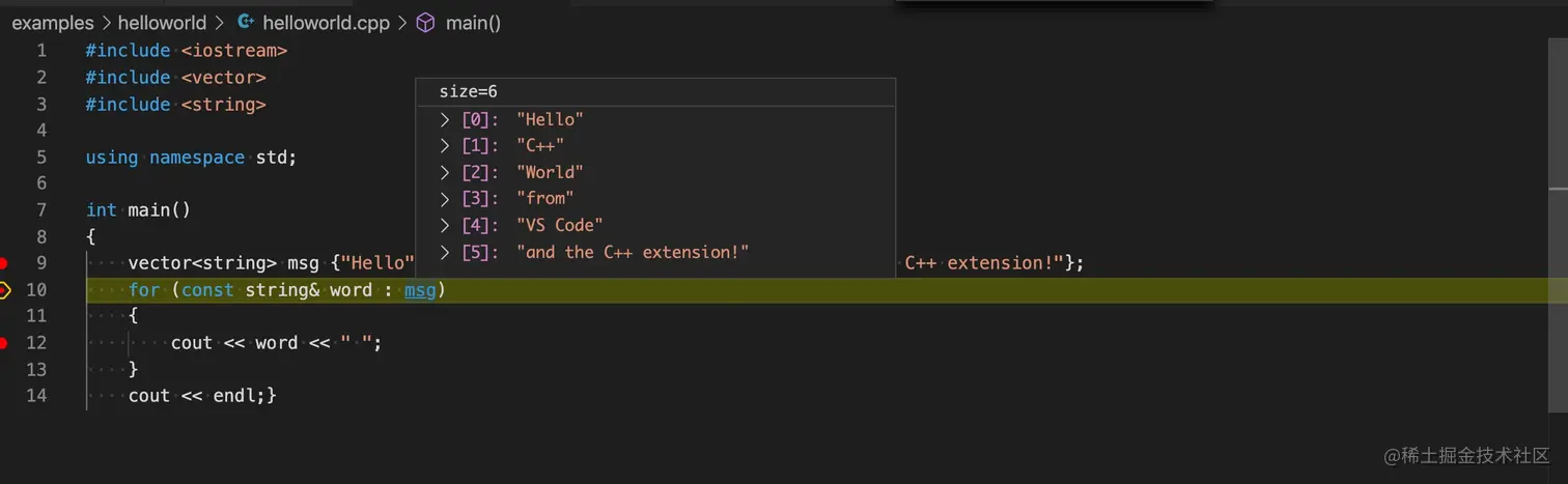 vector<string> msg {"Hello", "C++", "World", "from", "VS Code", "and the C++ extension!"};