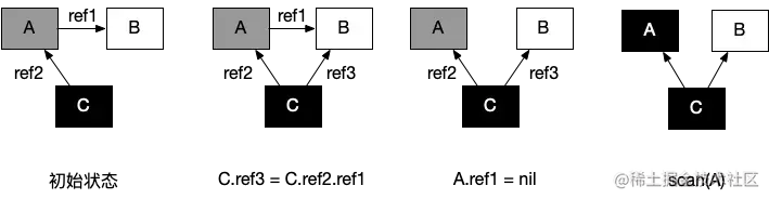 - C.ref3 = C.ref2.ref1:赋值器并发地将黑色对象 C 指向(ref3)了白色对象 B;