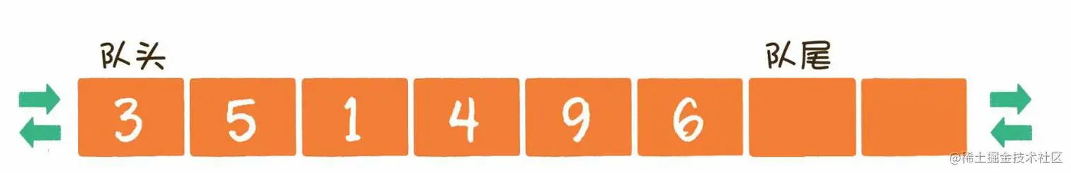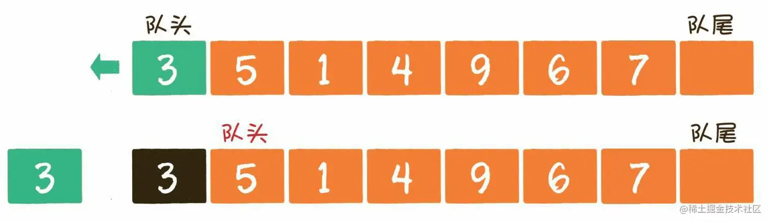 出队操作(dequeue)就是把元素移出队列,只允许在队头一侧移出元素,出队元素的后一个元素将会成为新的队头。