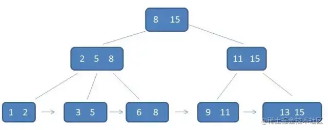 - 有k个子树的中间节点包含有k个元素(B树中是k-1个元素),每个元素不保存数据,只用来索引,所有数据都保存在叶子节点。