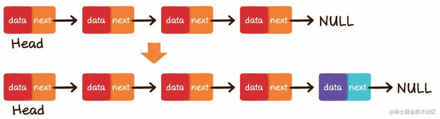 尾部插入,把最后一个节点的next指针指向新插入的节点即可。