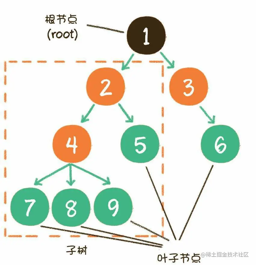 - 当n>1时,其余节点可分为m(m>0)个互不相交的有限集,每一个集合本身 又是一个树,并称为根的子树。