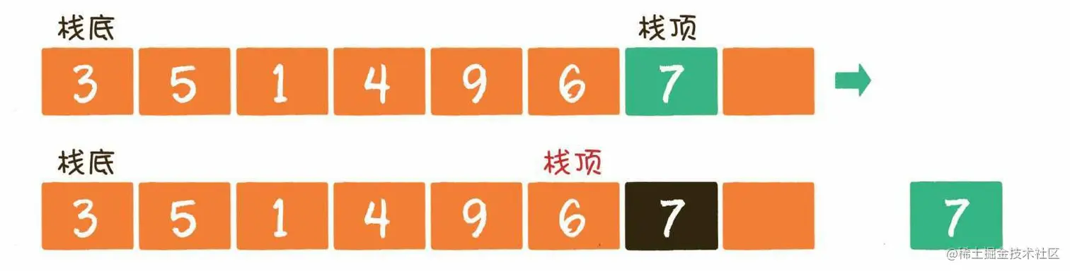 出栈操作(pop)就是把元素从栈中弹出,只有栈顶元素才允许出栈,出栈元素的前一个元素将会成为新的栈顶。