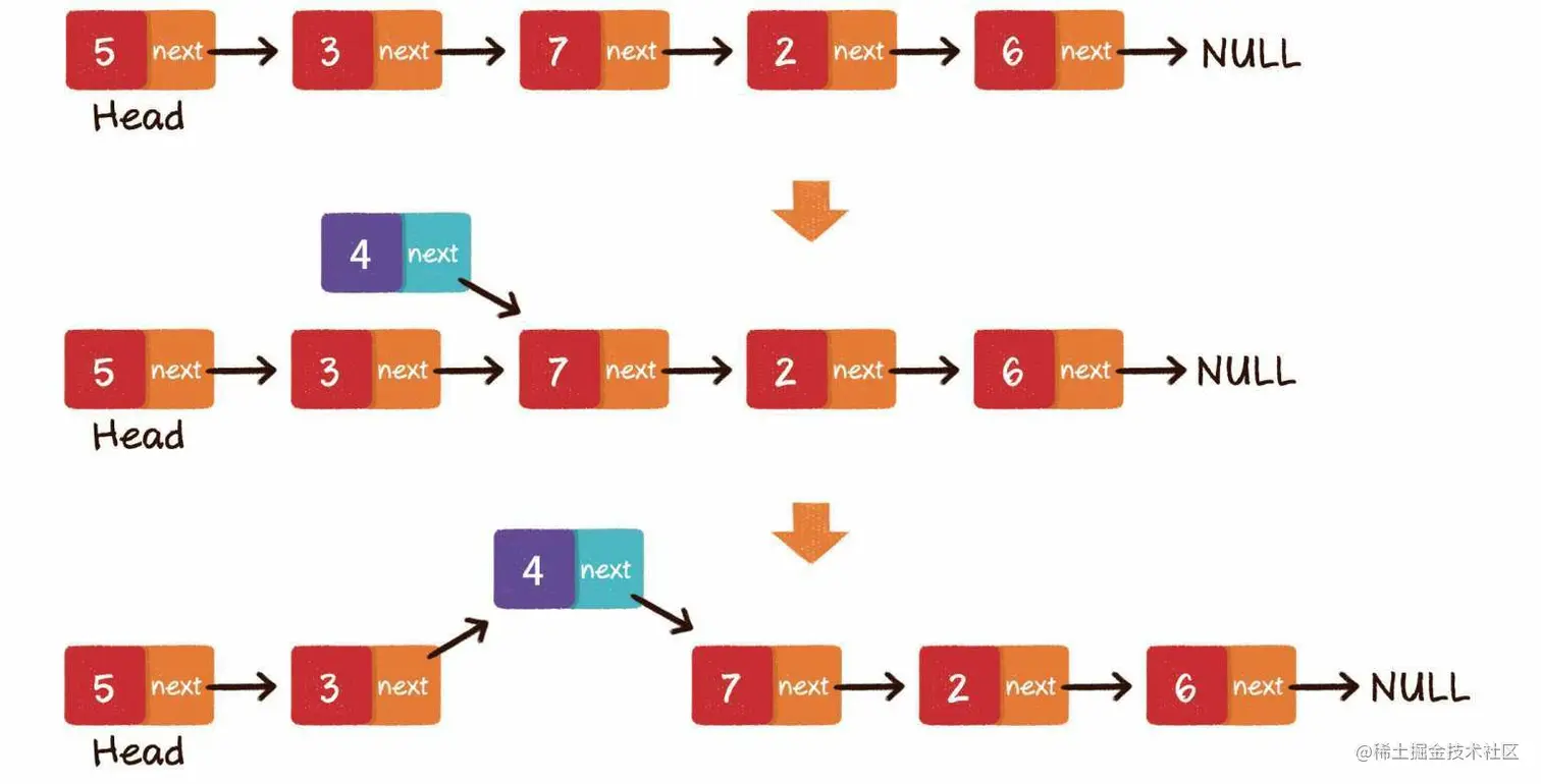 中间插入,同样分为两个步骤。 第1步,新节点的next指针,指向插入位置的节点。 第2步,插入位置前置节点的next指针,指向新节点。