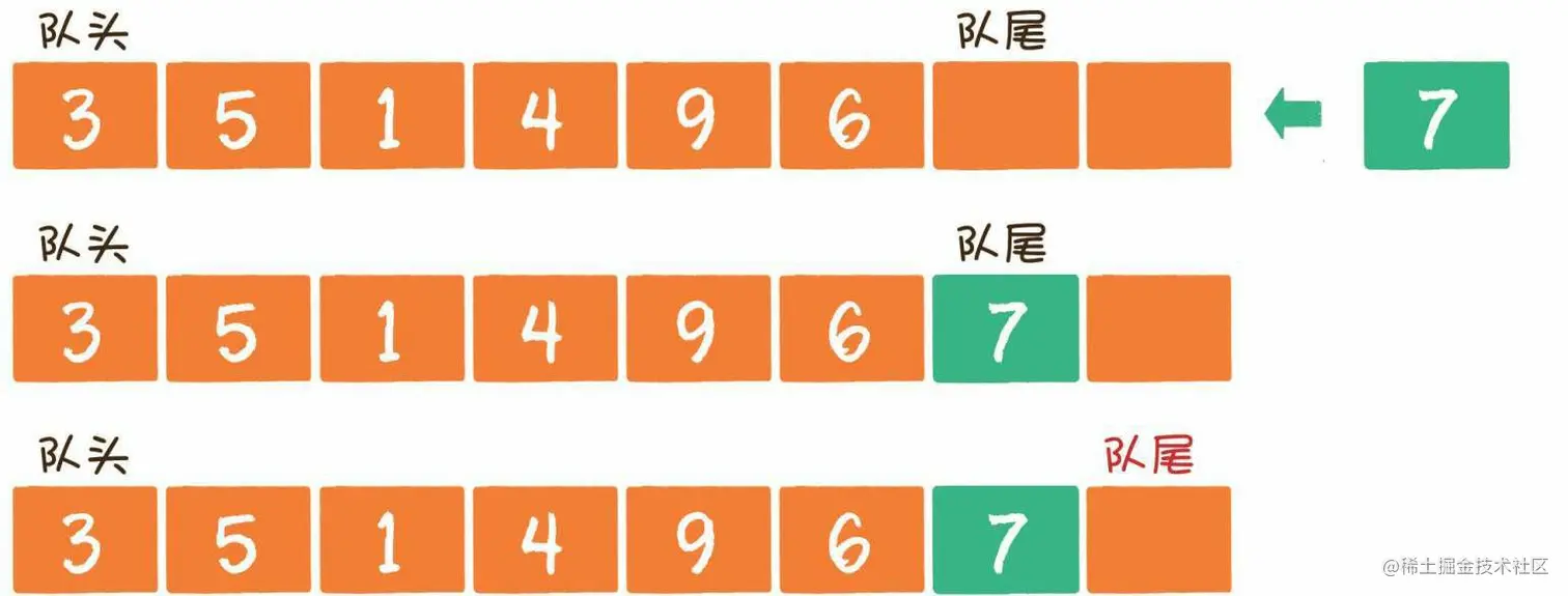 入队(enqueue)就是把新元素放入队列中,只允许在队尾的位置放入元素, 新元素的下一个位置将会成为新的队尾。