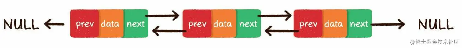 双向链表比单向链表稍微复杂一些,它的每一个节点除了拥有data和next指针,还拥有指向前置节点的prev指针。