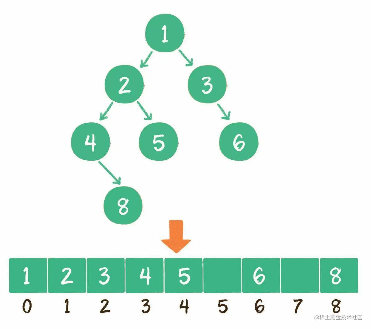 2.数组。使用数组存储时,会按照层级顺序把二叉树的节点放到数组中对应的位置上。 如果某一个节点的左孩子或右孩子空缺,则数组的相应位置也空出来。