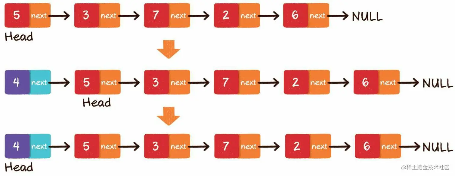 头部插入,可以分成两个步骤。 第1步,把新节点的next指针指向原先的头节点。 第2步,把新节点变为链表的头节点。