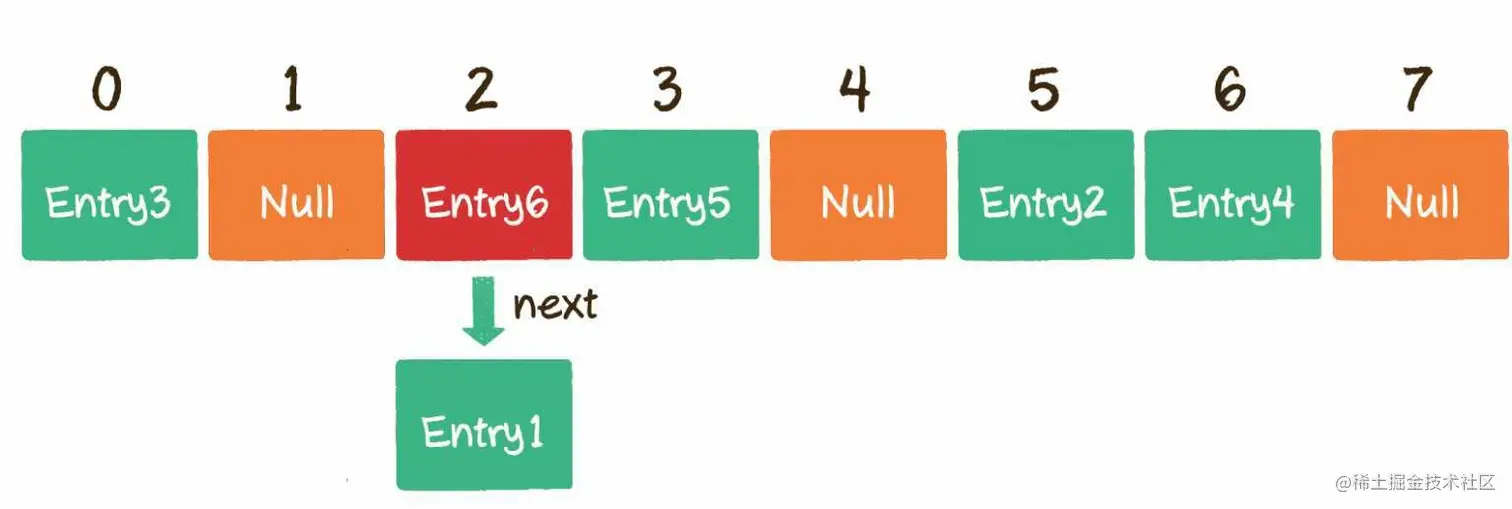 其做法是将散列到同一个值的所有元素保留到一个链表中。