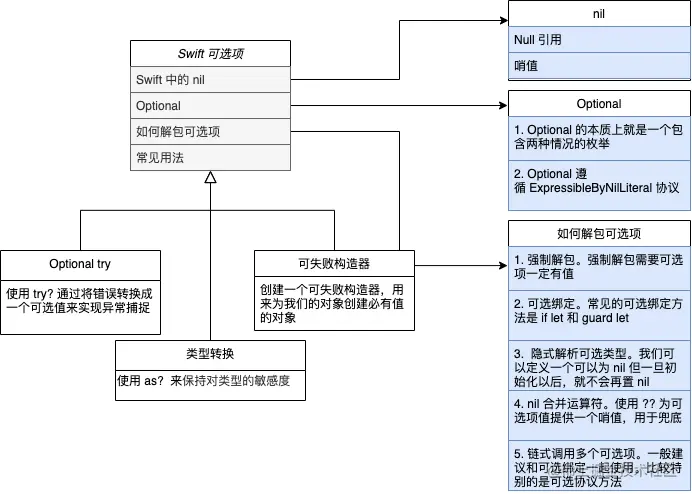 Optional 是一个遵守 ExpressibleByNilLiteral 协议的的一种枚举, 官方文档中不建议我们让其他 **哨值 **通过协议一致性来支持这个 ExpressibleByNilLiteral 协议。