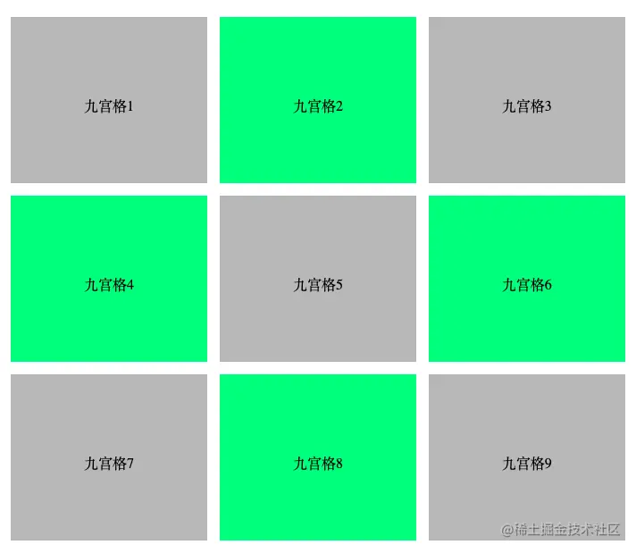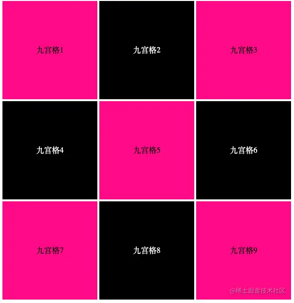 原理:使用grid创建网格布局,划分为3x3的等分布局