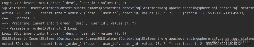 根据user_id将数据插入了ds2和ds1;根据order_id将数据分散到t_order_2和t_order_1,至此我们的分库和分表已经成功了。感兴趣还可以进行查询等操作,会根据传入的参数进行解析,散到不同的库和表中。