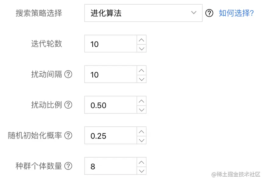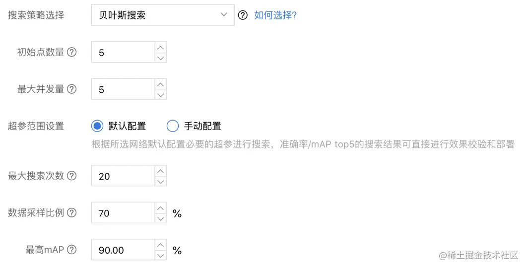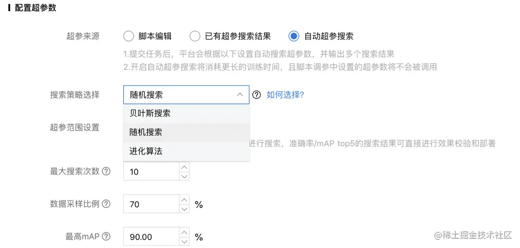【最大搜索次数】:是指最多组合出多少组超参并跑试验,当然有可能会因为提前达到目标而停止,节约费用。