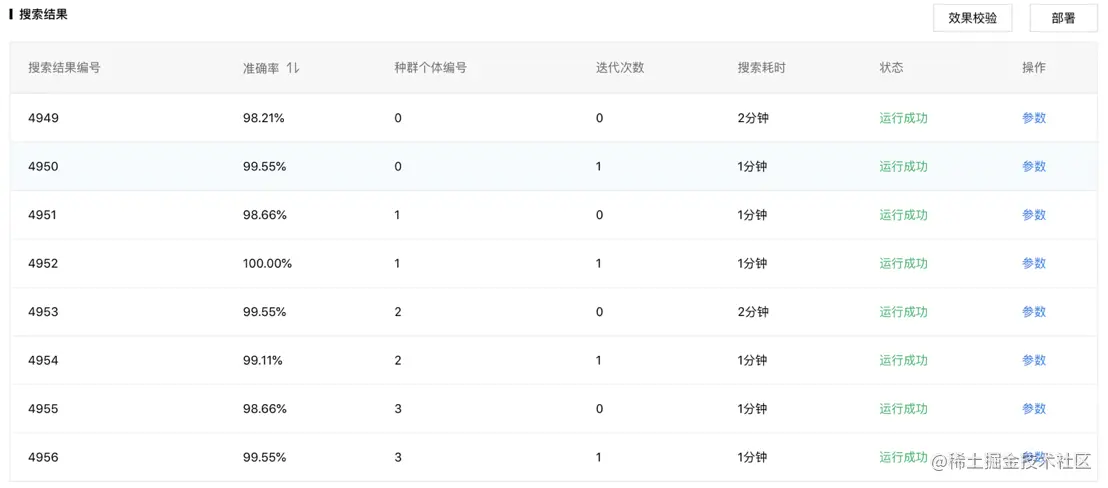 超参搜索训练完成后,效果最优的5次试验可以看到详细的评估结果,也能用于后续的效果校验和发布。当然,如果在超参搜索时对数据进行了采样,这时候可以重新发起一次训练任务,用这次搜索出来效果满意的超参数进行全量数据训练,从而获得完整数据的模型效果