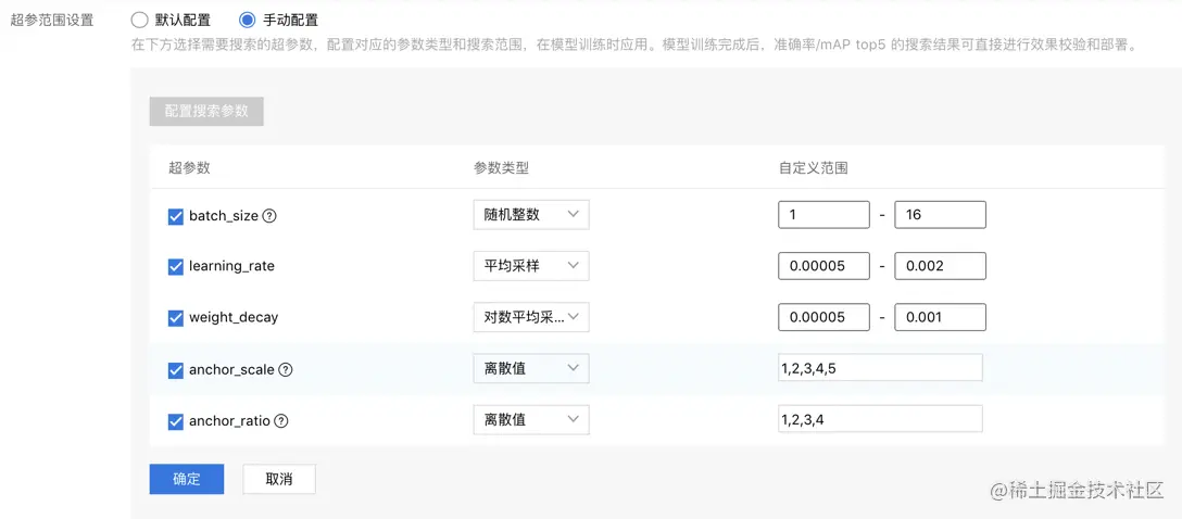 【超参范围设置】:可以是默认配置,也可以手动配置。默认的话百度的工程师们已经帮我们对不同网络、GPU卡型设置了一个基本靠谱的搜索范围,直接用就可以。当然也可以手动配置,可以自定义各个超参的范围,可以看到物体检测支持以下这些超参自定义搜索范围: