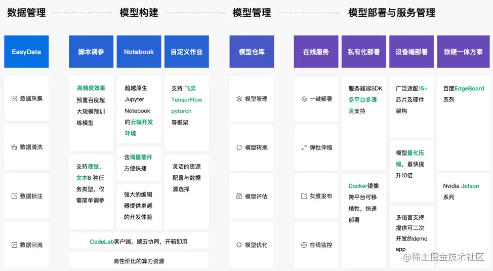 全功能AI开发平台BML(Baidu Machine Learning) ,是为企业和个人开发者提供机器学习和深度学习一站式AI开发服务,并提供高性价比的算力资源,助力企业快速构建高精度AI应用。BML提供了从数据采集、数据清洗、数据标注、智能标注与多人标注、模型训练生产到模型管理、云端及离线推理服务管理等AI开发过程的全生命周期管理功能。