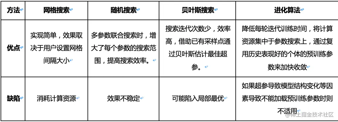 上表归纳了一下这些搜索方法的优缺点。总之,网格搜索和随机搜索实现上比较简单,不利用先验知识选择下一组超参数,其中随机搜索效率相对较高。贝叶斯搜索和进化算法需要用前一轮的信息进行迭代搜索,搜索效率明显提升。