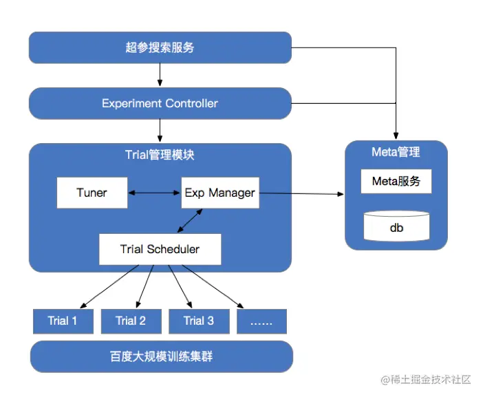 Trial是具体的训练试验,一个Experiment会产生多个Trial来探索不同超参数组合的最终效果。Tuner是超参生成的模块,会根据选择的超参搜索算法,推荐下一个Trial所使用的超参值。在Trial管理模块中,Exp Manager会负责生成若干Trial, 向Tuner请求具体的试验超参数,并向Trial Scheduler发送Trial任务信息。