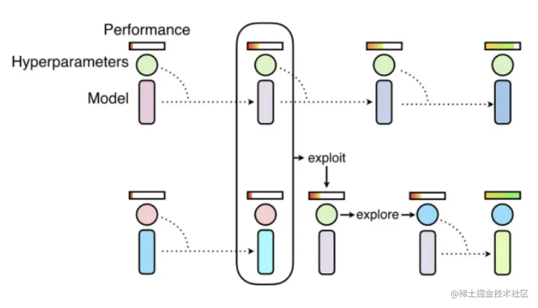 进化算法是一种基于种群概念的超参搜索策略,把超参配置视为一个种群,并行优化多个种群并在种群内部进行优胜劣汰的筛选,最终输出最佳模型。这个过程(如下图所示)是从遗传算法获得的灵感,种群的初始化采用随机的方式生成,个体的优胜劣汰具体指利用(exploit)和探索(explore)两个步骤,不仅可能会从表现较好的个体中复制参数,它还能通过随机扰动修正当前的值而探索新的超参数组合。