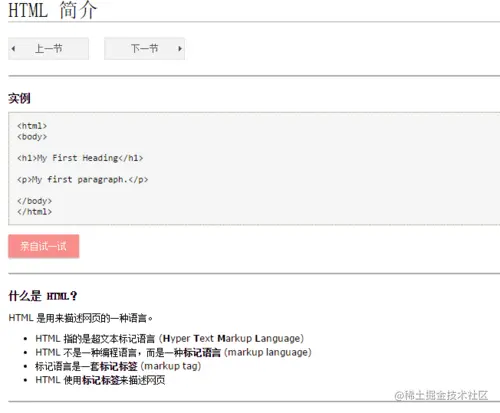 w3schools.com的教程中,几乎没有什么啰嗦理论。比如上图里,简单的一句介绍,HTML是用来做网站的,然后点击开始教程了,迎面而来的,就是“实例”和“试一试”功能按钮。