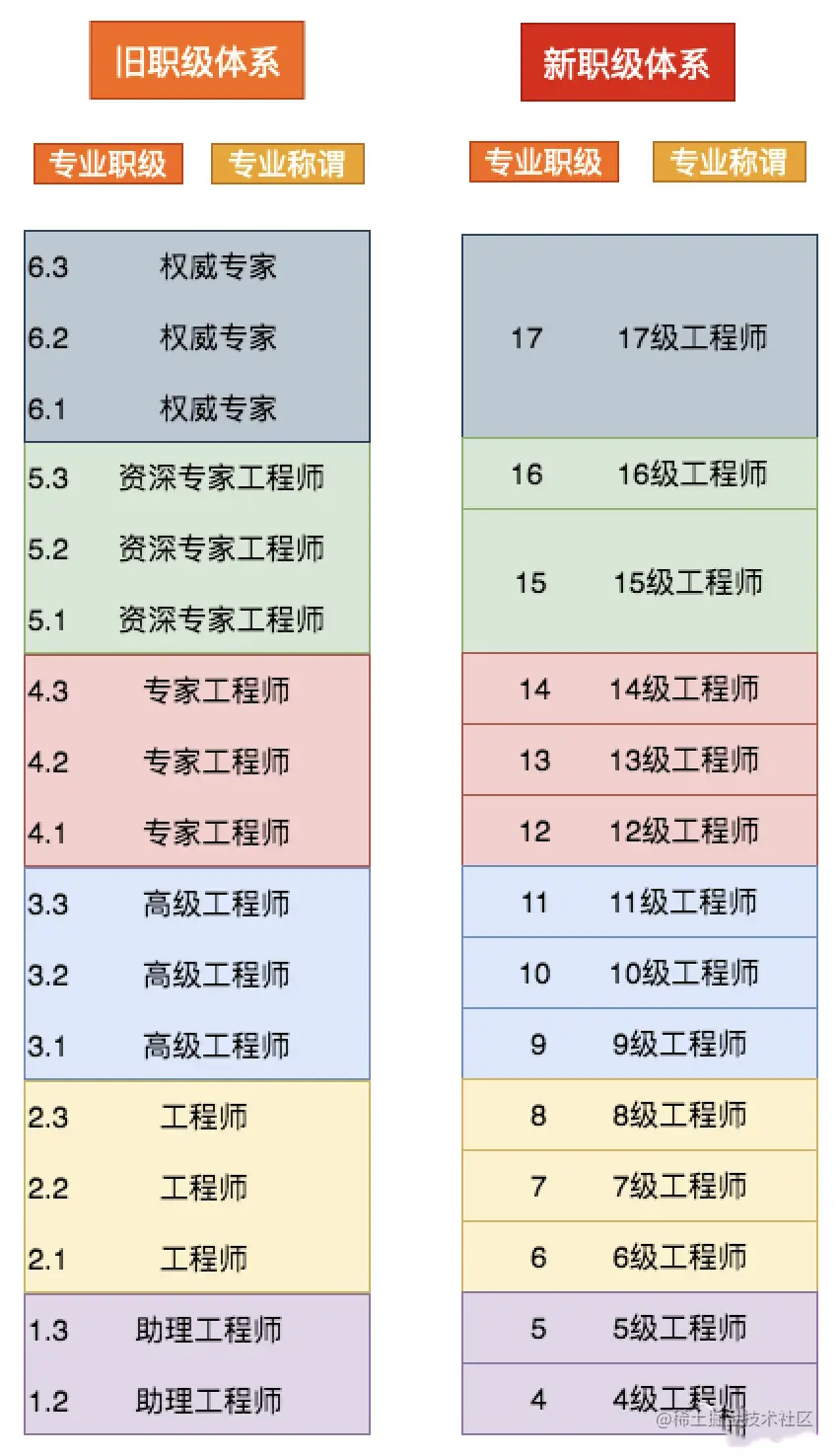 通常来说,面试9级或9级以上的岗位,才需要面委。这里的9级是什么意思呢?且看公开信息中的腾讯技术通道职级体系(左旧右新):