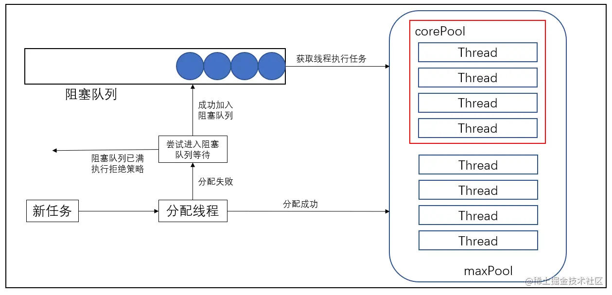 - corePoolSize 核心线程数,可以把他理解为常驻线程,所有新来的任务都会先尝试是否有空闲的corePool线程可以获取,如果获取失败,则会进入阻塞队列进行等待