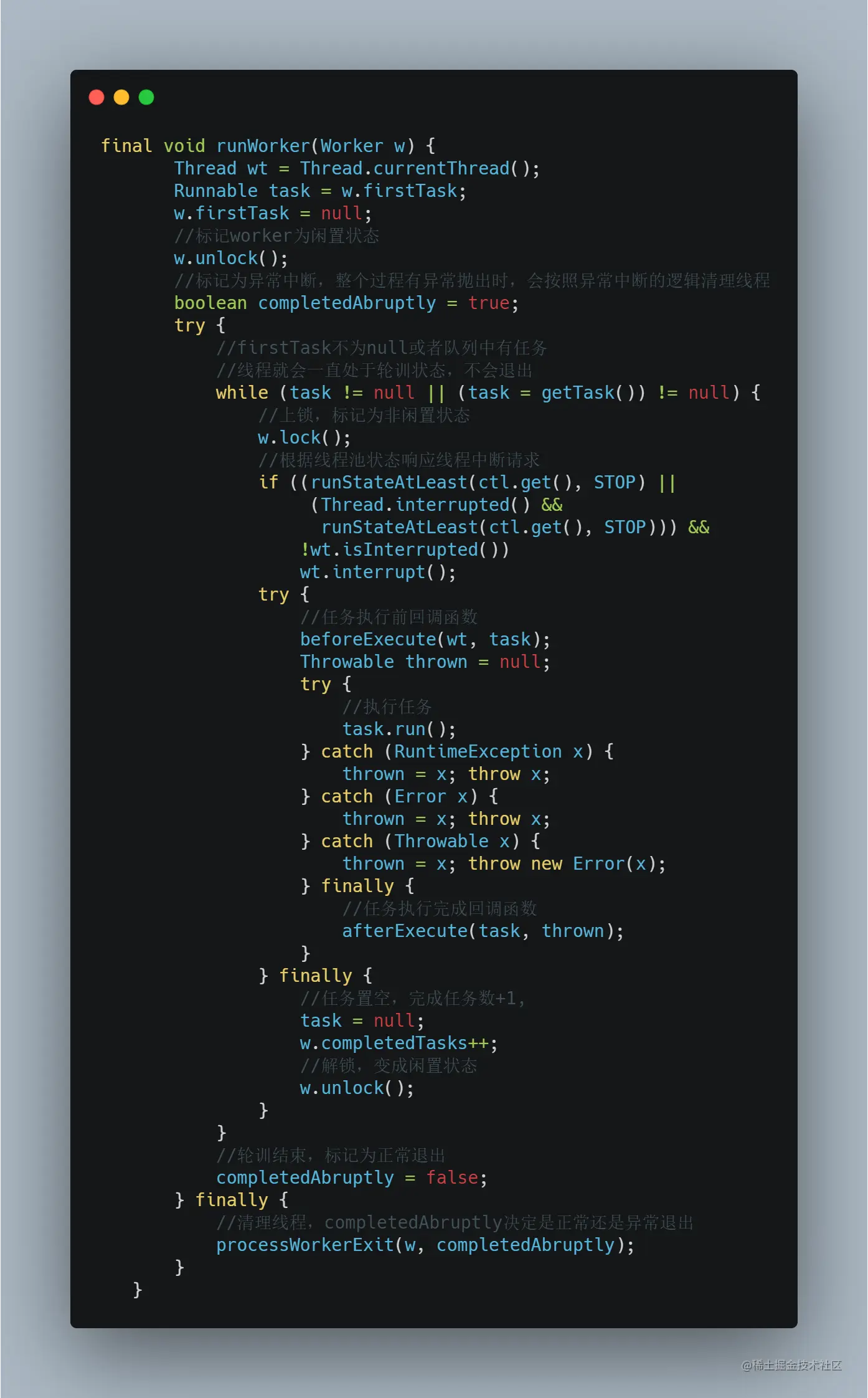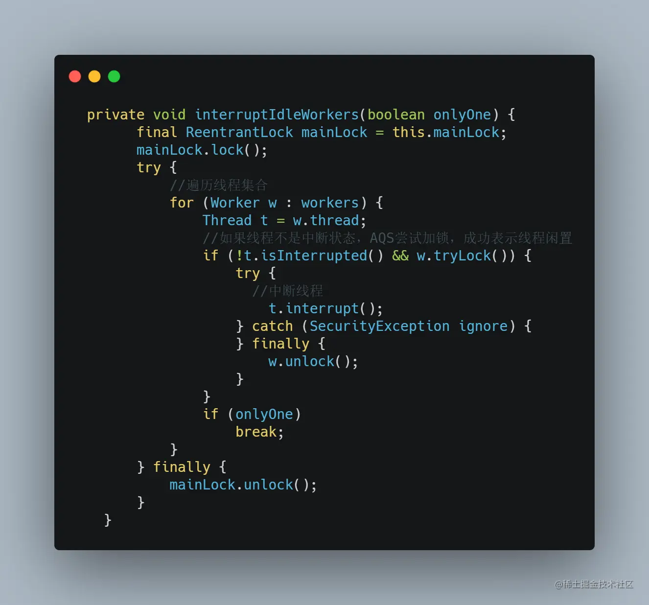 这个过程中,还会调用interruptIdleWorkers()中断闲置的线程,就是遍历线程集合,根据线程是否加锁判断线程是否闲置,如果是直接调用Thread.interrupt进行中断。
