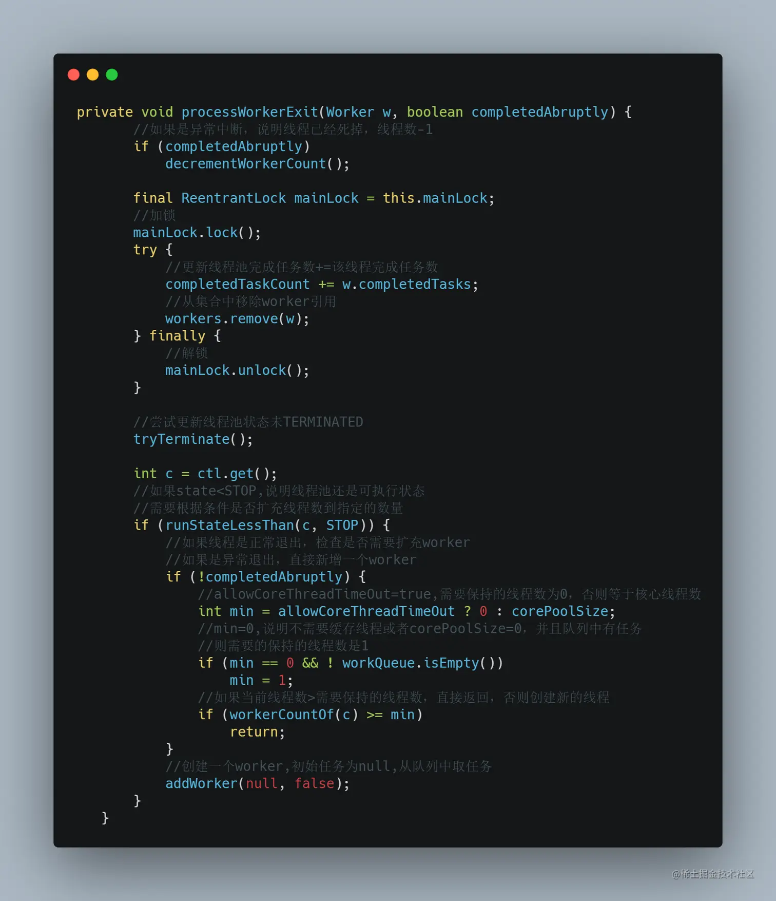 当线程正常退出轮训,说明队列中没有任务可执行了并且当前线程数超过了核心线程(或者设置了allowCoreThreadTimeOut=true),就要清理线程,使线程始终保持在设定的值,当然线程异常退出(执行过程中抛了异常或者被中断)也是要需要清理的