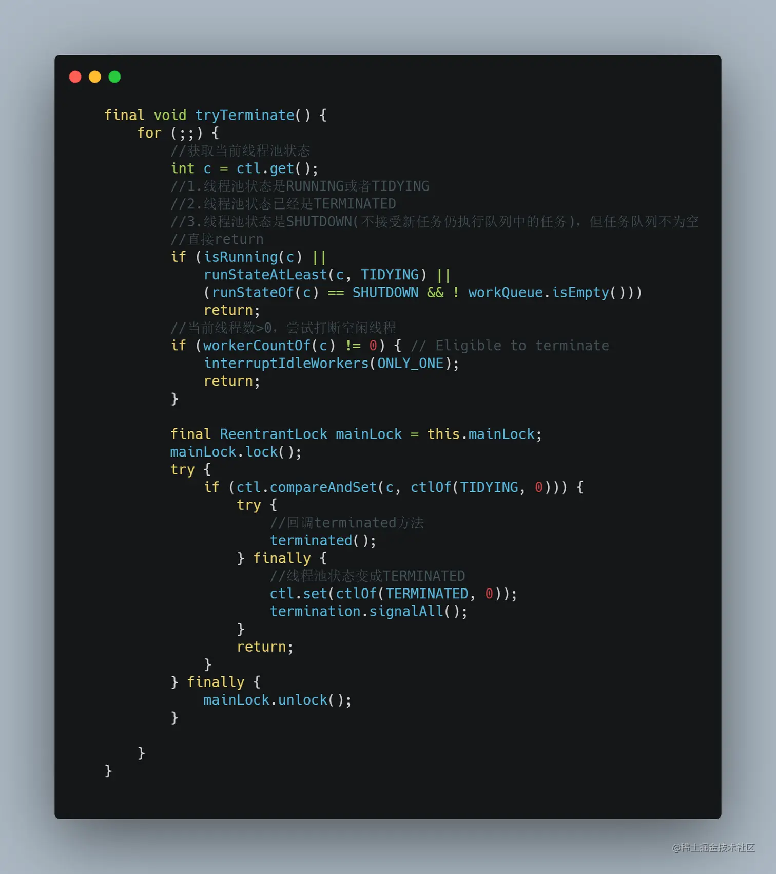 清理线程过程中,会尝试改变线程池状态为TERMINATED,为啥?因为线程池提供了shutdown()方法,不再需要的时候开发者需要手动关闭线程池。