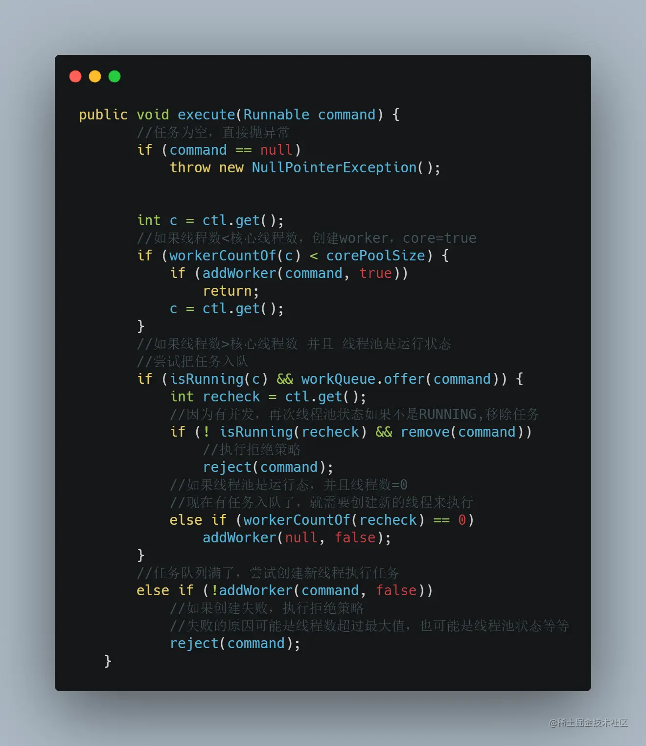 我们通常使用execut方法提交任务,下图的源码非常清楚的提现了上面所述的任务调度流程