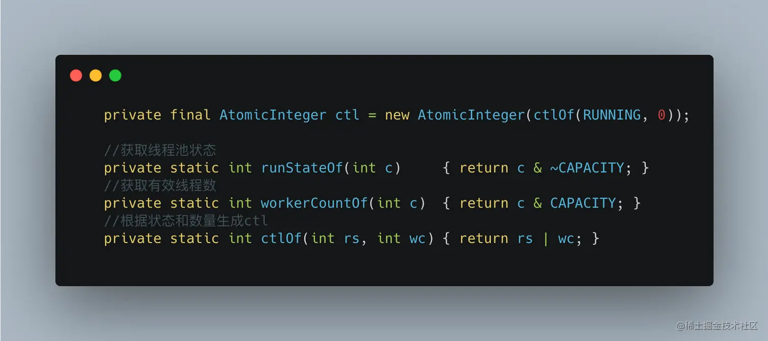 线程池有自己的生命周期,但不是用户显示设置的,而是伴随着任务的执行,由线程池内部维护的。线程池用一个Int变量ctl维护两个值:runState(线程池生命周期状态)和workerCount(当前线程数 ),高3位表示生命周期,低29位表示当前线程数。同时提供了对应方法来获取当前状态和有效线程数数量,这是一个高效优化,因为线程池内部有大量使用这2个值的地方,用一个变量来存储,可以避免在做对用决策时,出现不一致的情况,也省去加锁带来的性能开销