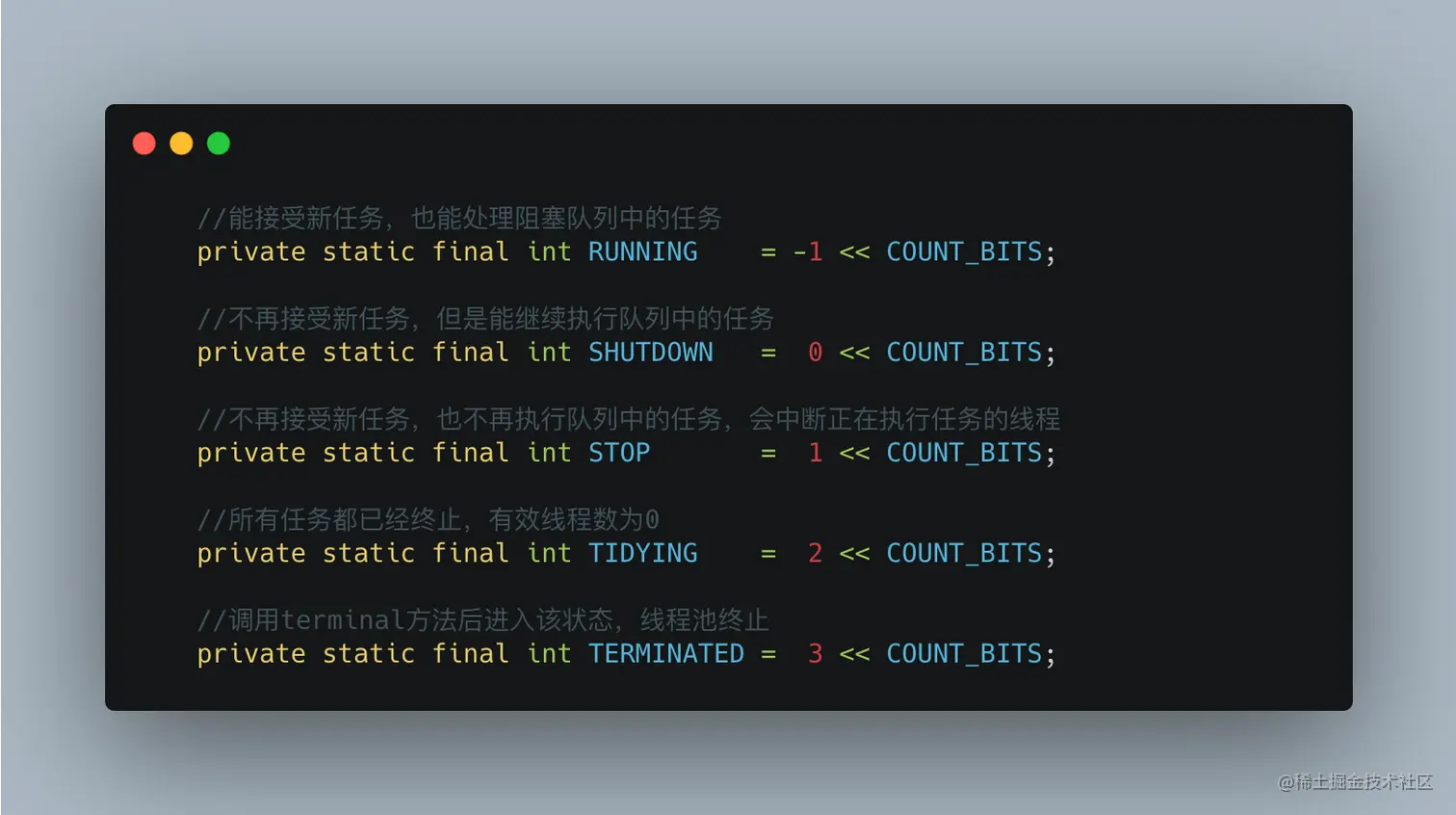 - TERMINATED 终止,回调terinal后进入该状态,表示线程池已死