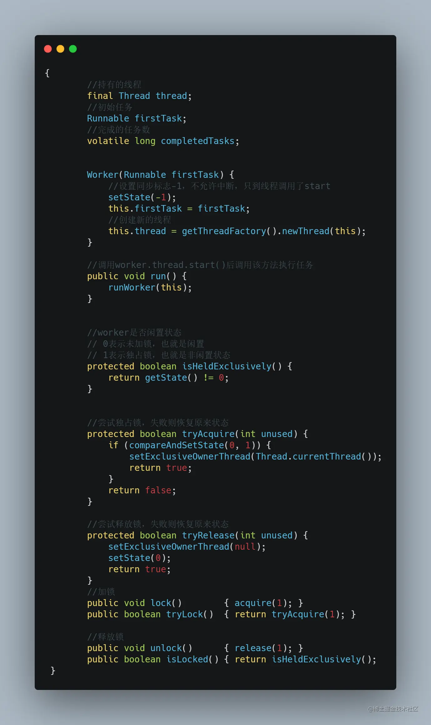 worker继承了AbstractQueuedSynchronizer,也就是常说的AQS,提供了lock和unlock等一系列方法表示当前线程是否闲置,在没有任务的时候,闲置的线程池会被回收,以保证线程数量等于核心线程数