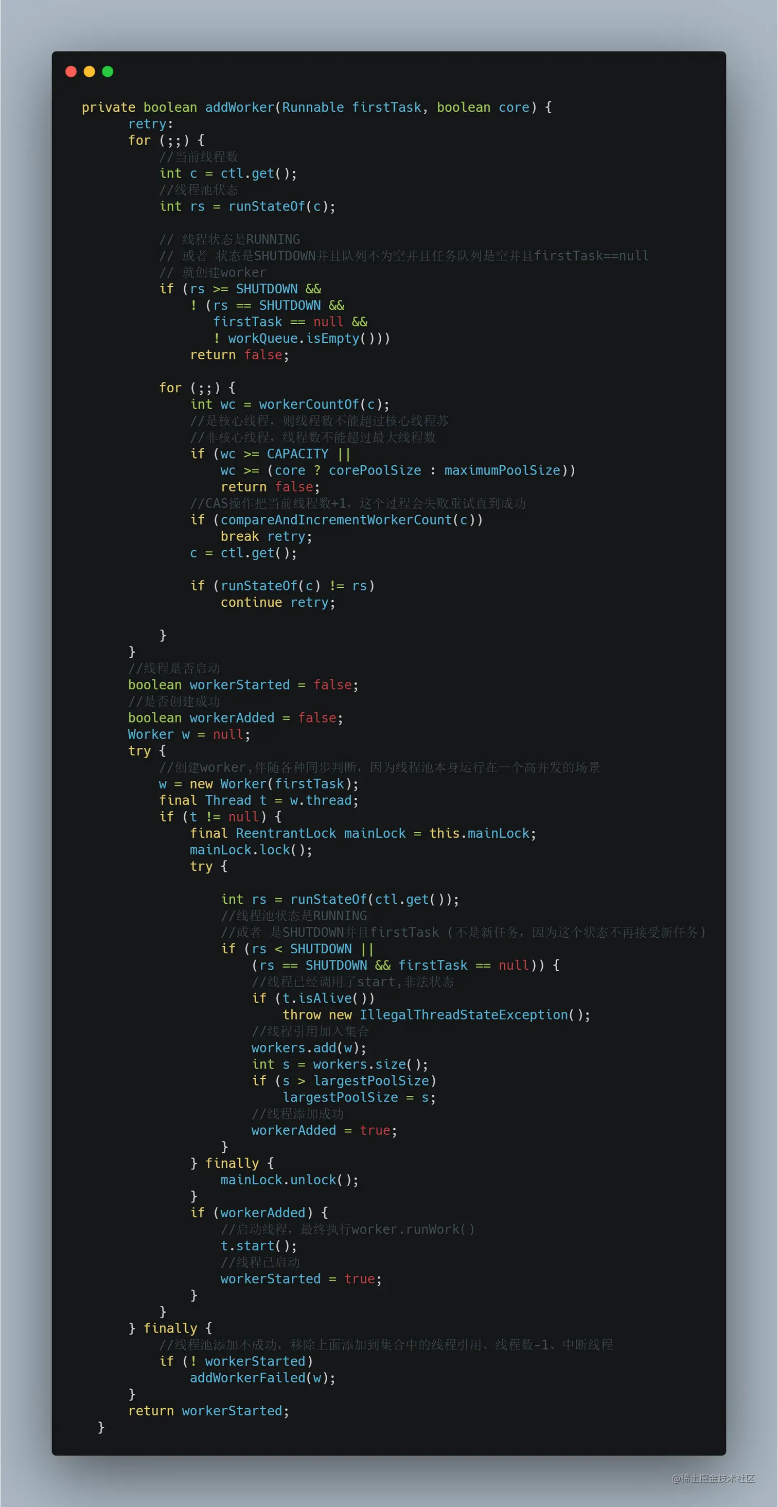 从上图可以看到,创建工作线程的逻辑是addWorker,首先根据core值判断线程数是否超过限制,创建工作线程或者返回失败。如果创建成功,把线程引用添加进集合,调用worker内部的thread.start()启动线程,最终调用到worker.runWork()执行任务