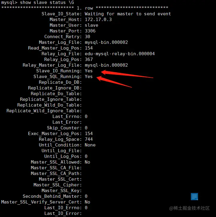 change master to master_host='172.17.0.3', master_user='slave', master_password='123456', master_port=3306, master_log_file='mysql-bin.000001', master_log_pos= 609, master_connect_retry=30;