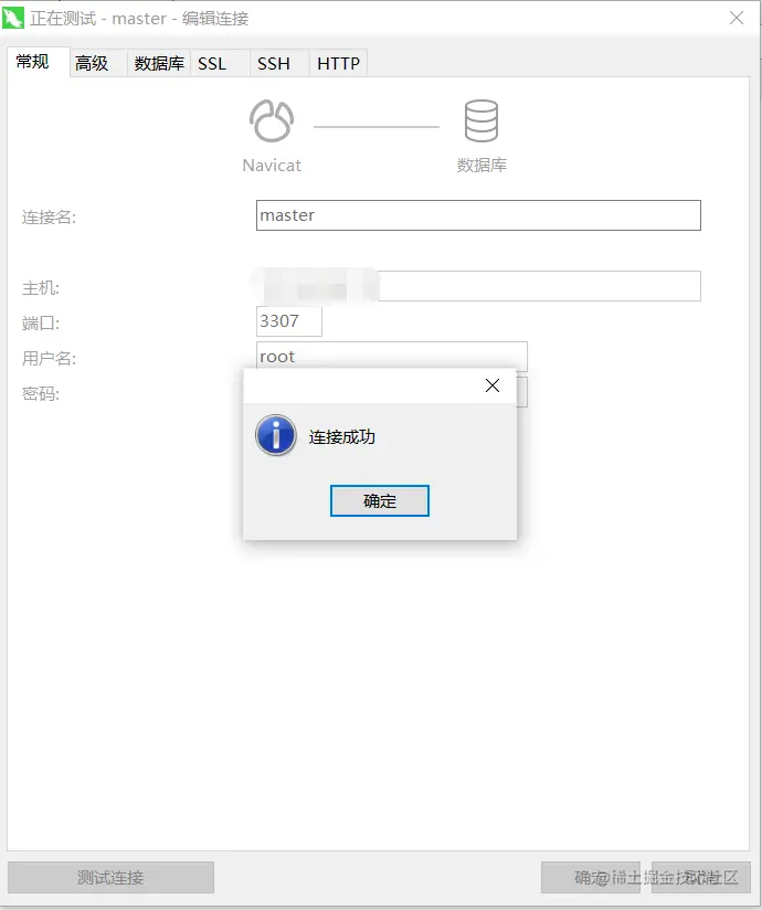 用Navicat连接测试,启动容器是对外的端口主库是3307,从库是3308。