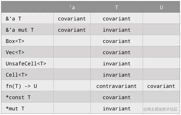 &'a T和&'a mut T是'a的协变,因为在一个期望得到短的生命周期的地方传递一个更长的生命周期总是可以的。除非它们被包裹在可变引用或相似事物中。 -