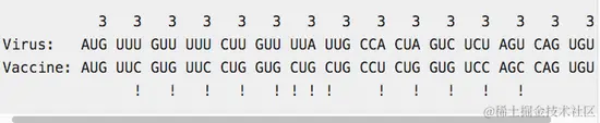 ‘信号肽’不是很长,但是当我们看代码时,病毒和疫苗的RNA是有区别的: