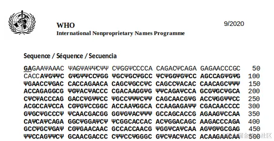 让我们从疫苗的一小部分源代码开始,下图为世界卫生组织公布的BNT162b前500个字符。