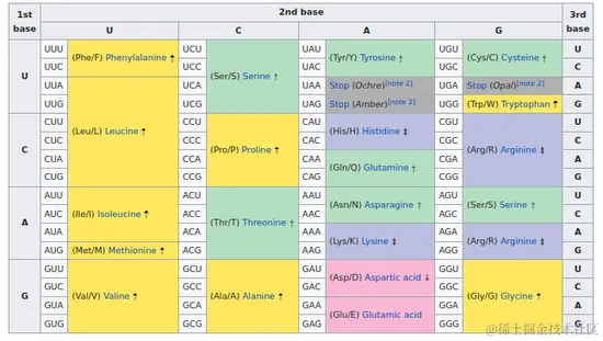 下表映射了RNA密码子和氨基酸之间的编码关系: