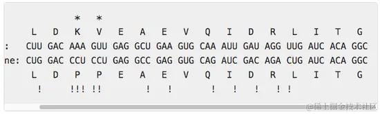 上面的第三和第四个密码子代表了实际的变化。那里的K和V氨基酸都被P或脯氨酸所取代。对于‘K’,这需要改变三次(‘!!’),而对于‘V’,这只需要改变两次(‘!!’)。