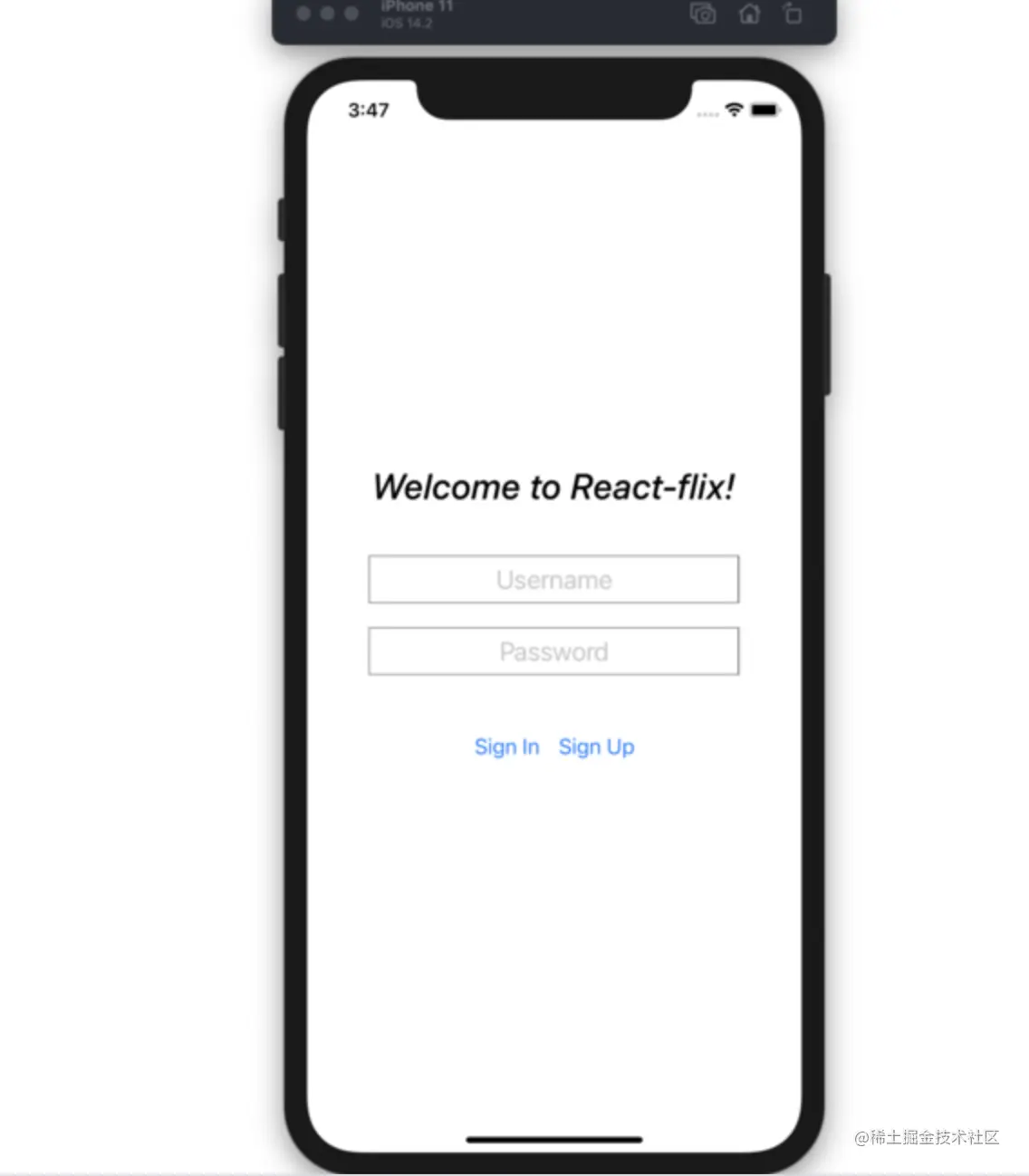 此帐户组件将包含一个看起来熟悉的登录/注册模板。在React Native中,此视图可能如下所示: