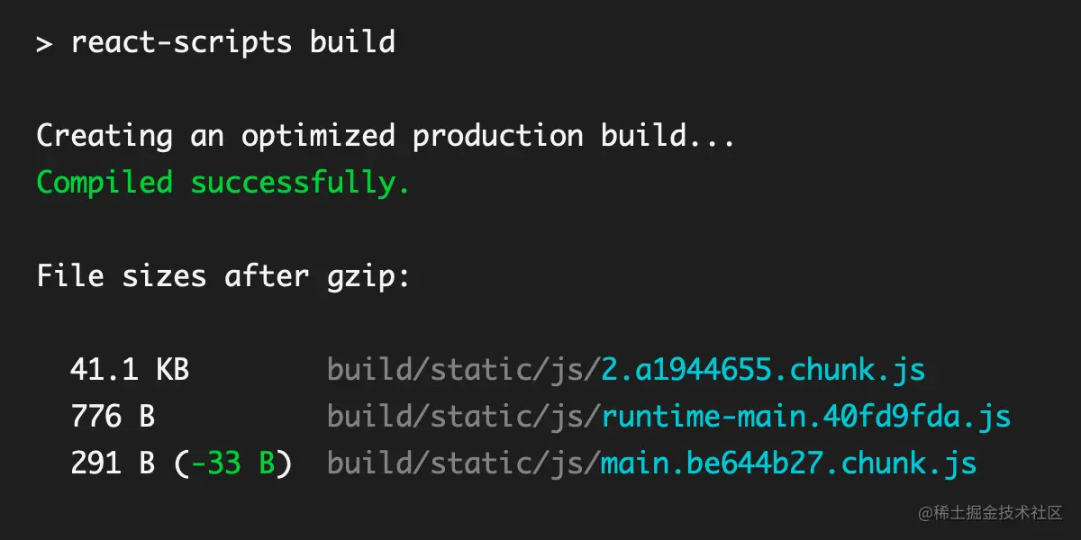 脚本将运行构建函数,将所有独立的文件捆绑到一个bundle.js文件中,而不是检查可用的端口并运行开发服务器。生产构建还将确保您的代码得到优化和缩小,以确保其具有最佳性能。 如果您以前已经运行过构建命令,脚本将获取您当前的文件大小,并将其与下一次构建进行比较。它将向您显示文件大小发生了多大变化: